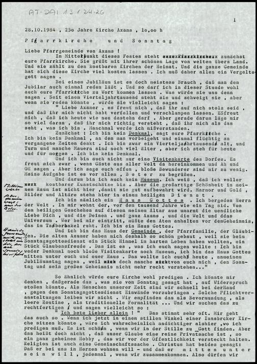 Maschingeschriebenes Manuskript mit Anmerkungen