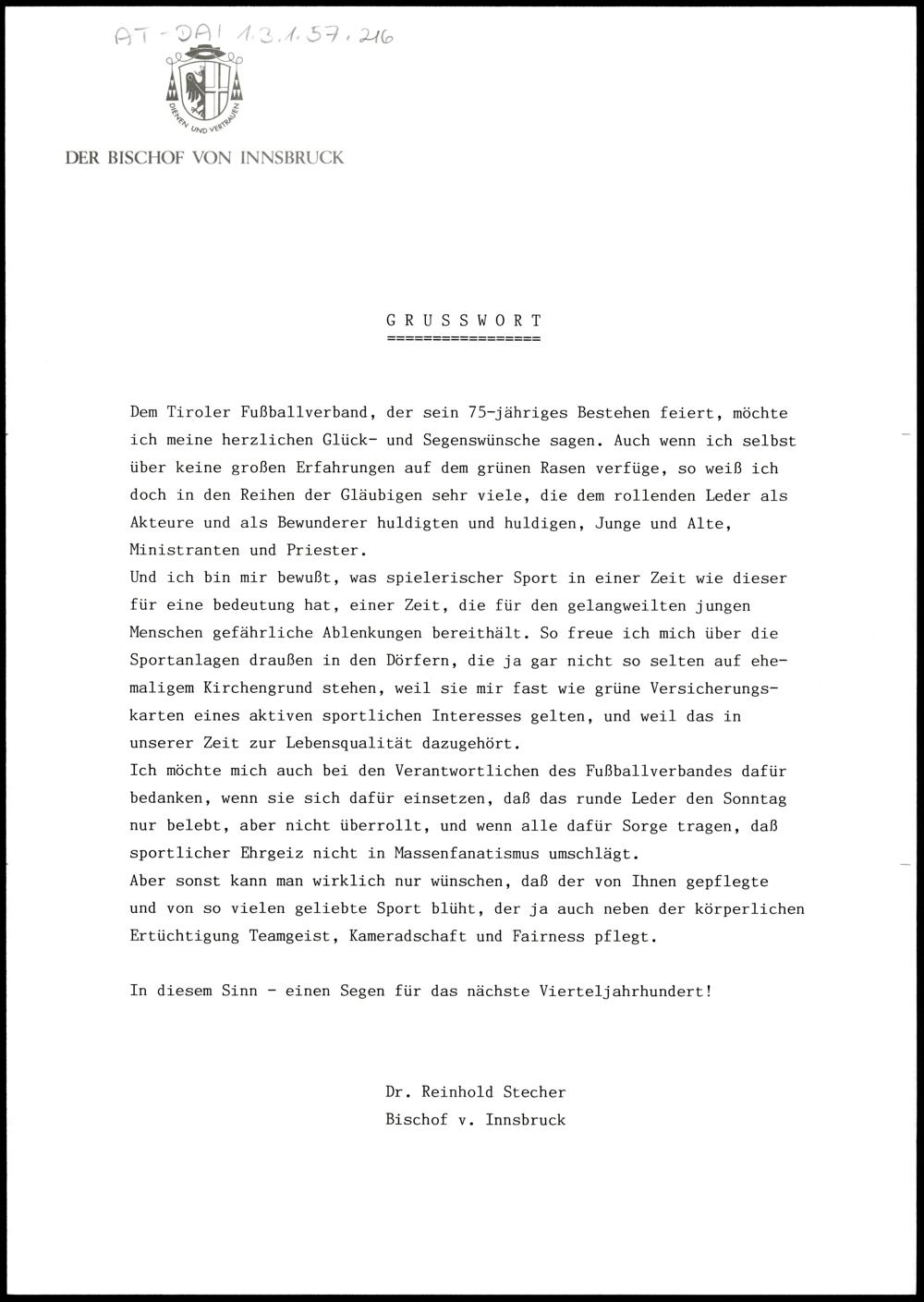 Grußwort dem Tiroler Fussballverband