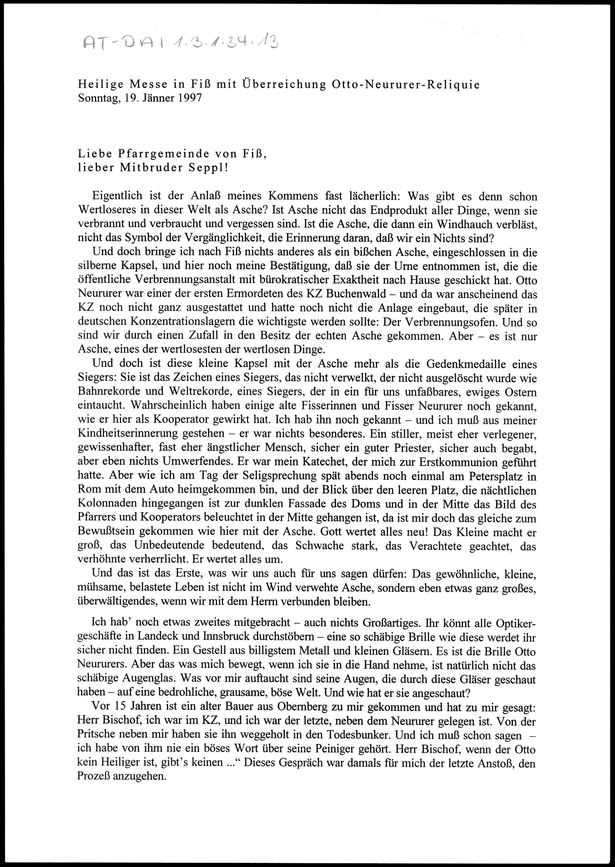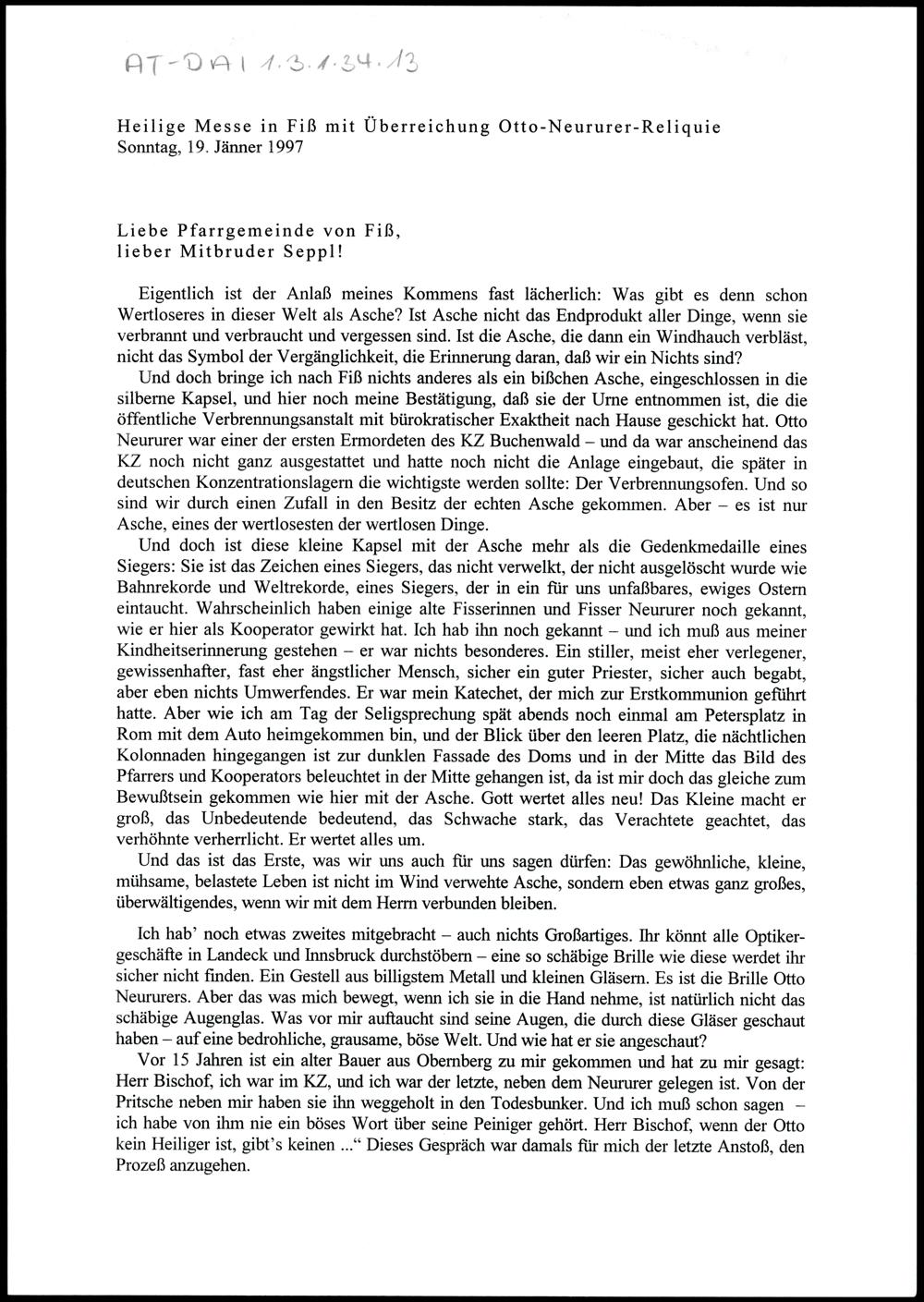 Heilige Messe in Fiss mit Überreichung Otto-Neururer-Reliquie