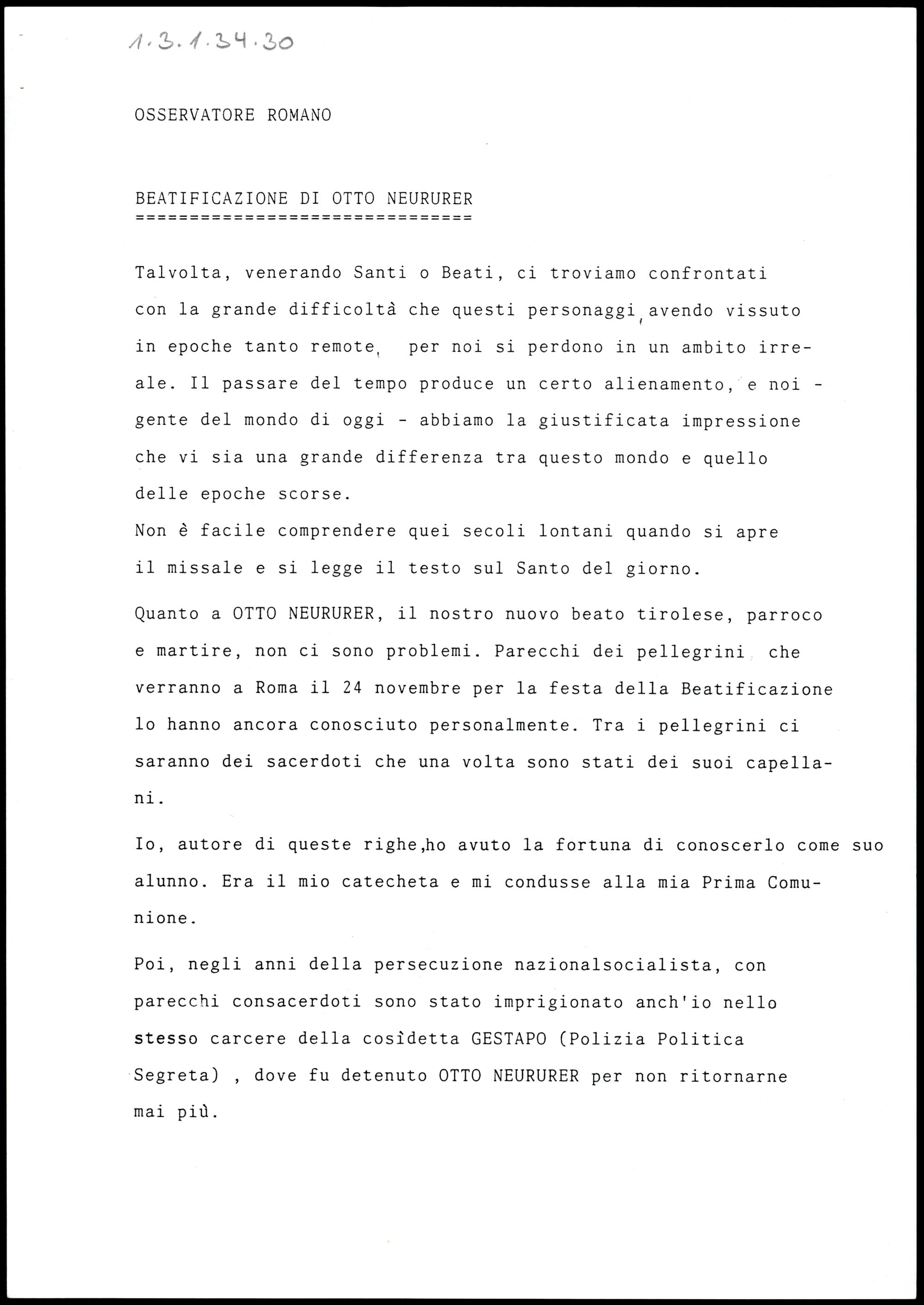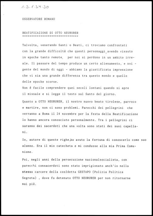 Italienischer Text zur Seligsprechung von Otto Neururer