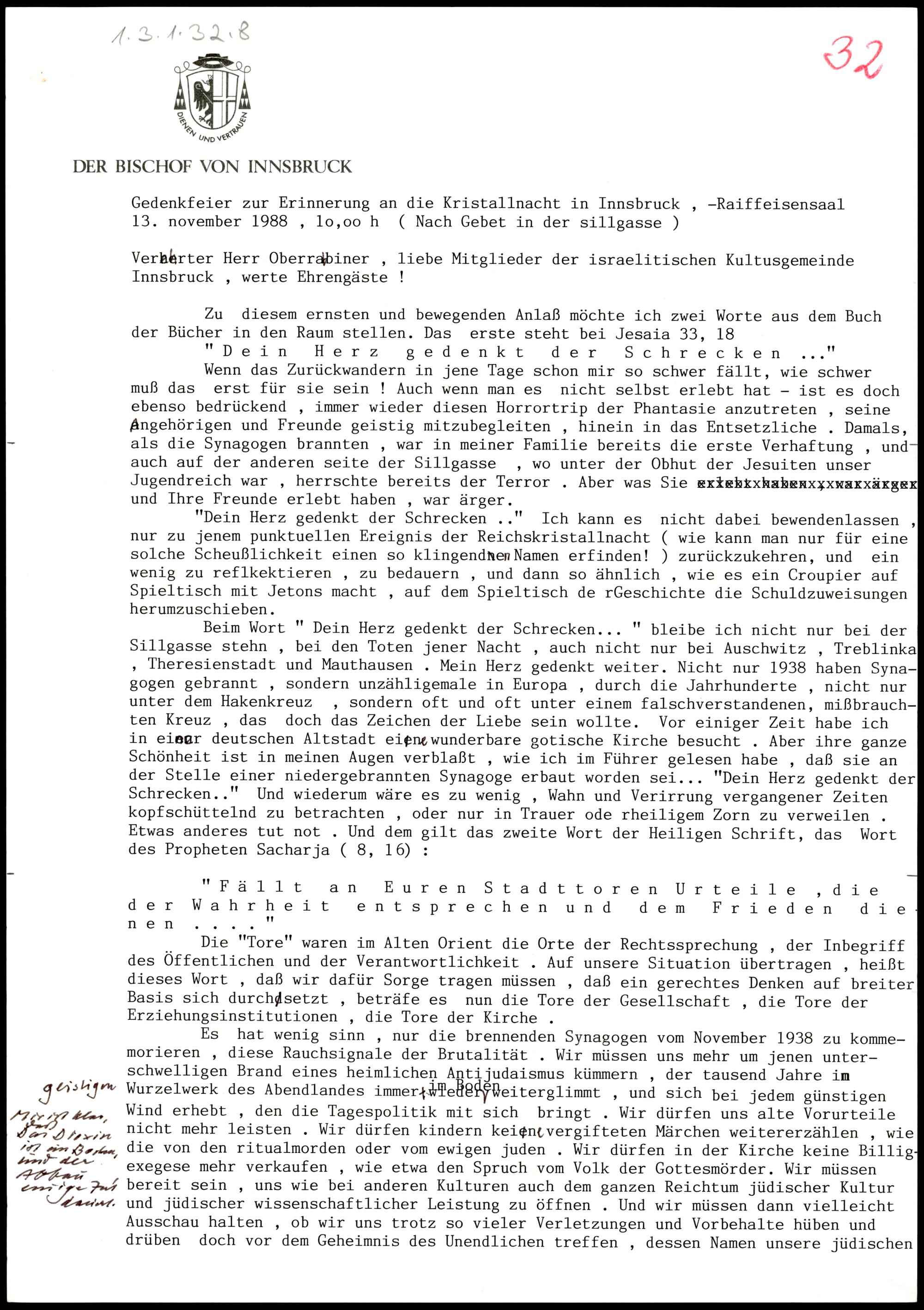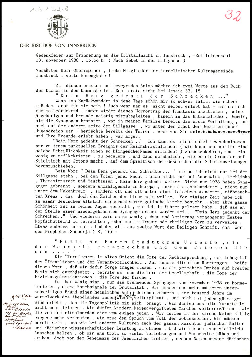 Gedenkfeier zur Erinnerung an die Kristallnacht in Innsbruck. 13.11. Maschingeschriebenes...