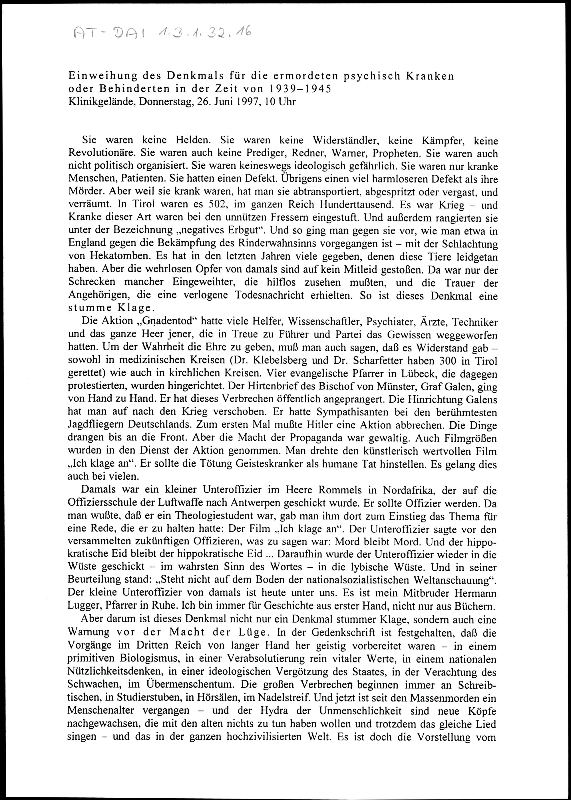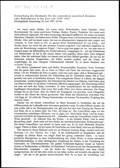 Einweihung des Denkmals für die ermordeten psychisch Kranken oder Behinderten in der Zeit von 1939-1945