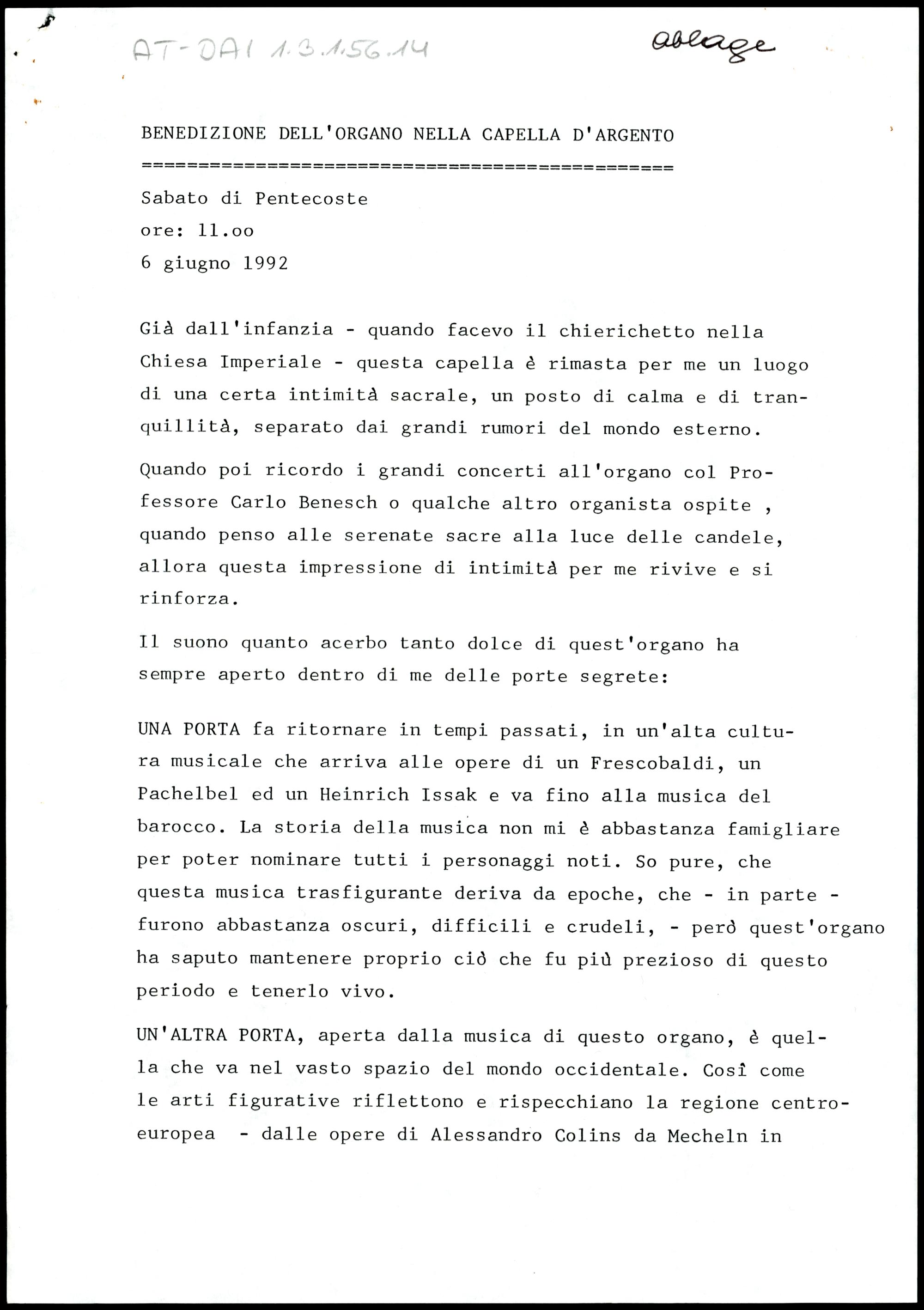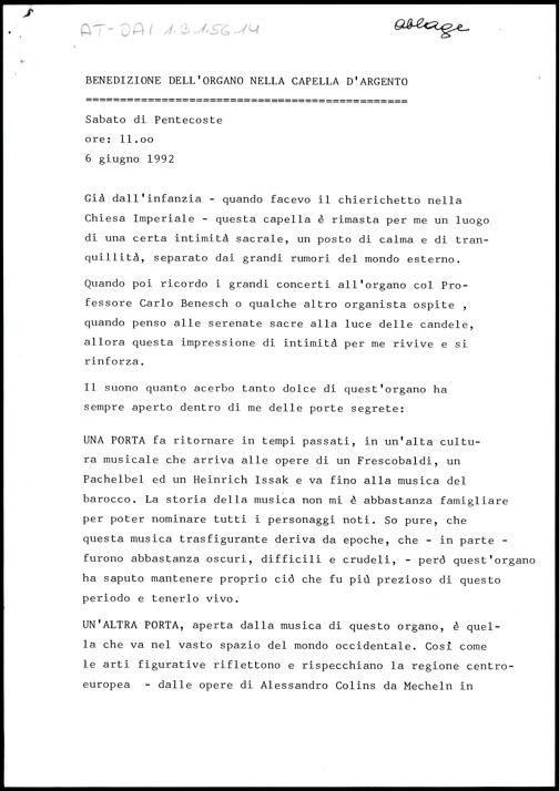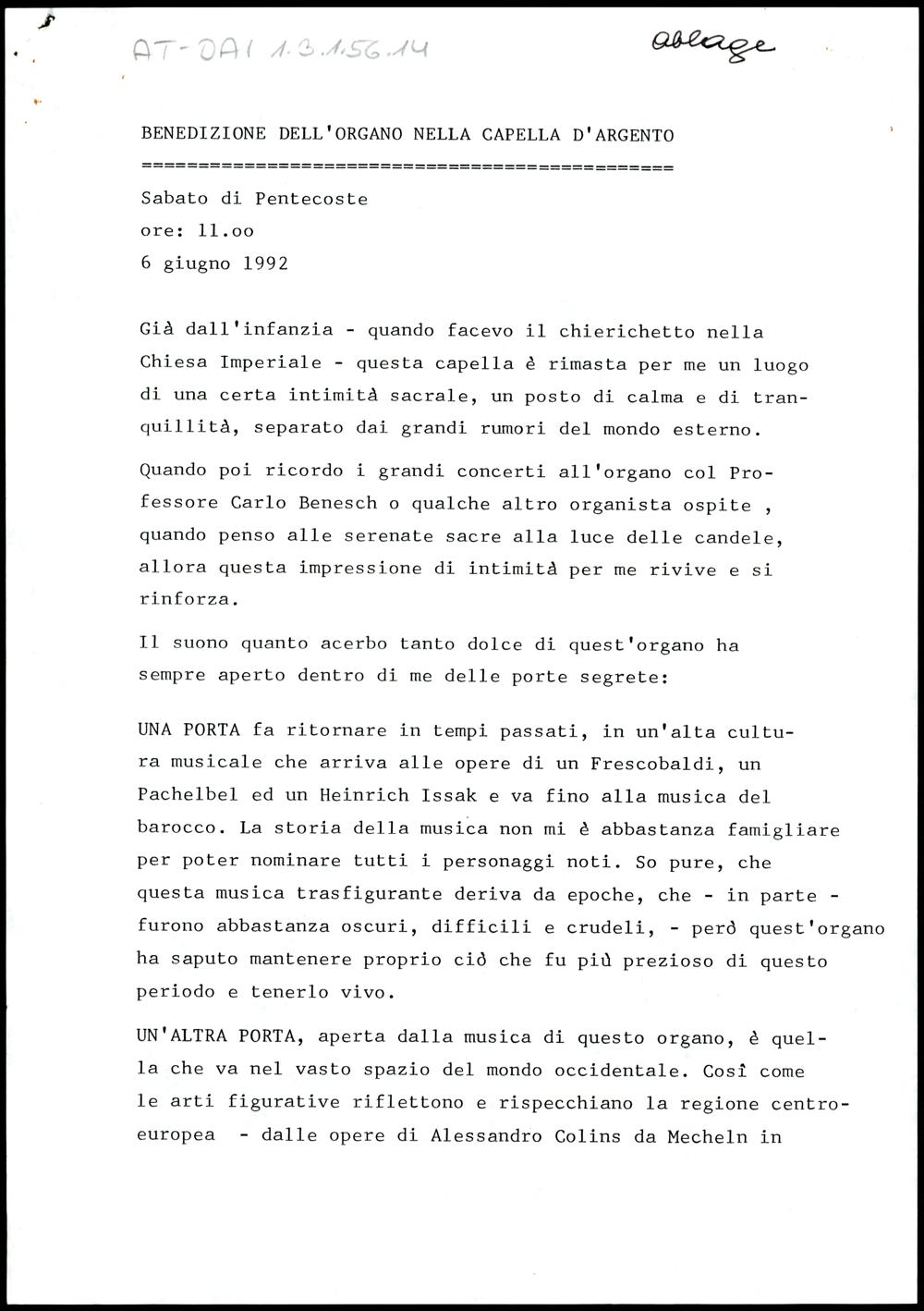 Benedizione dell´organo nella capella dárgento