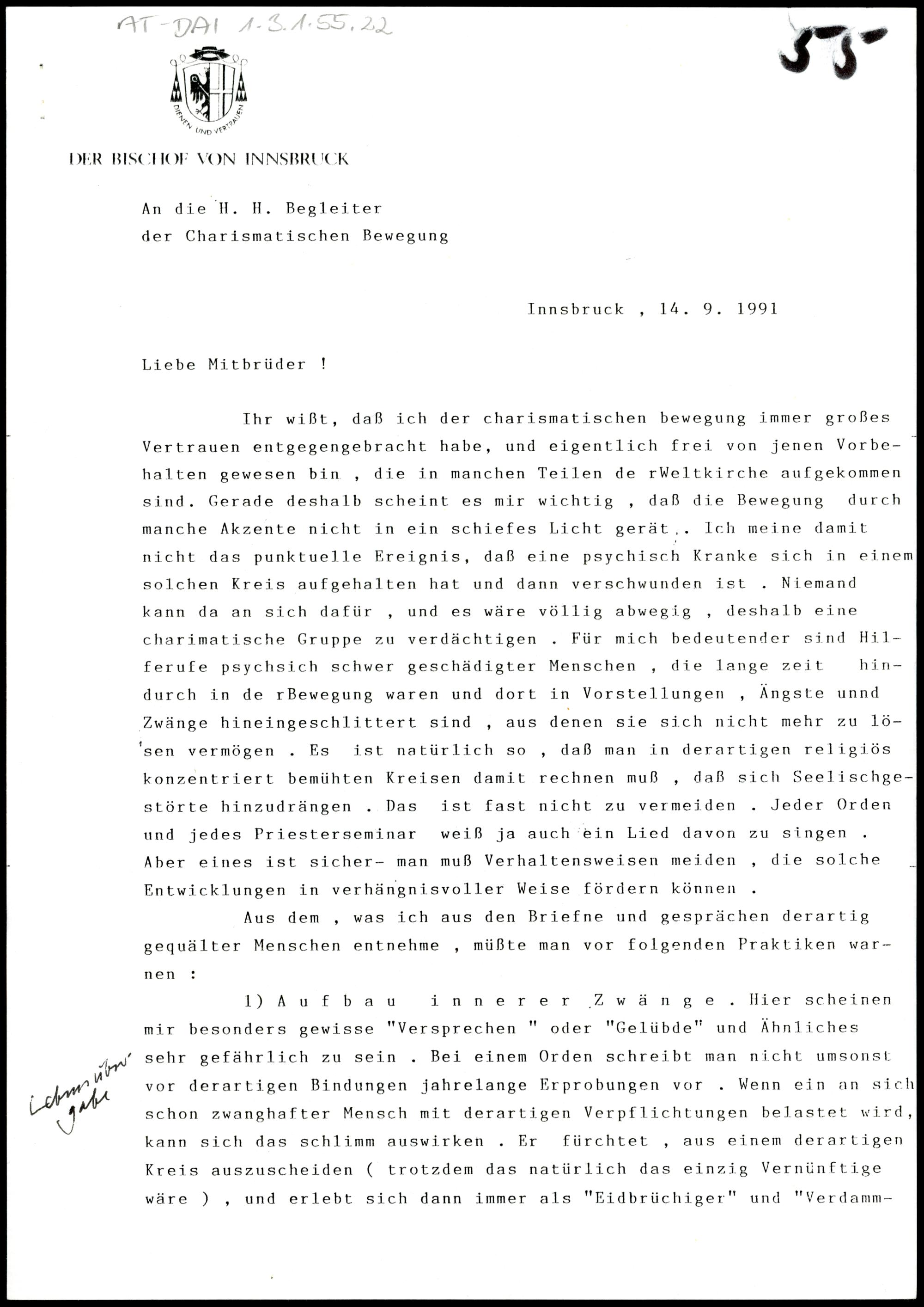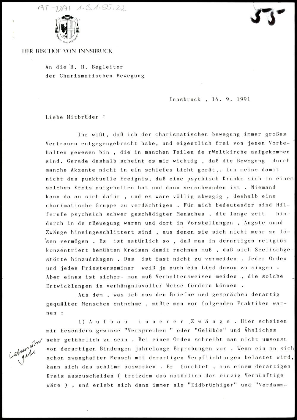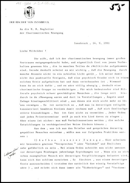 Brief an die H. H. Begleiter der Charismatischen Bewegung