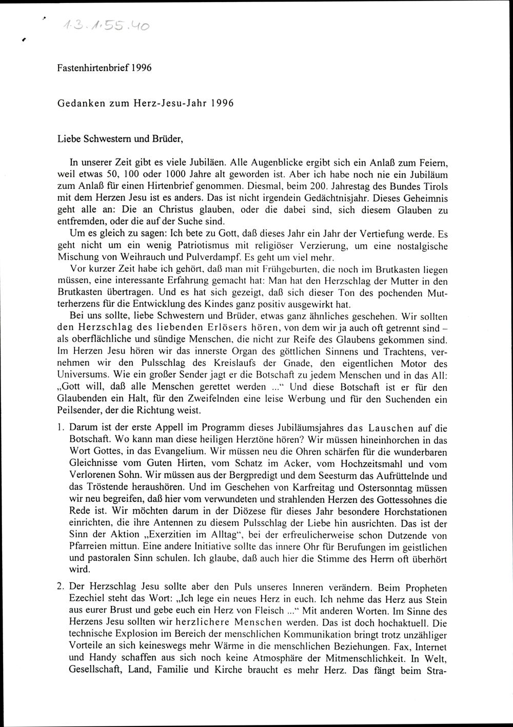 Fastenhirtenbrief 1996 im Verordnungsblatt der Diözese Innsbruck, 15.2.1996, Nr. 1