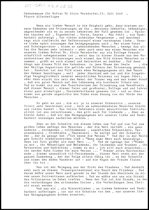 Gedenkmesse für Hofrat Dr. Alois Berndorfer