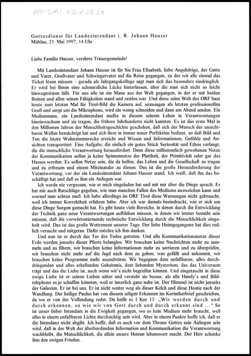 Gottesdienst für Landesintendant i. R. Johann Hauser