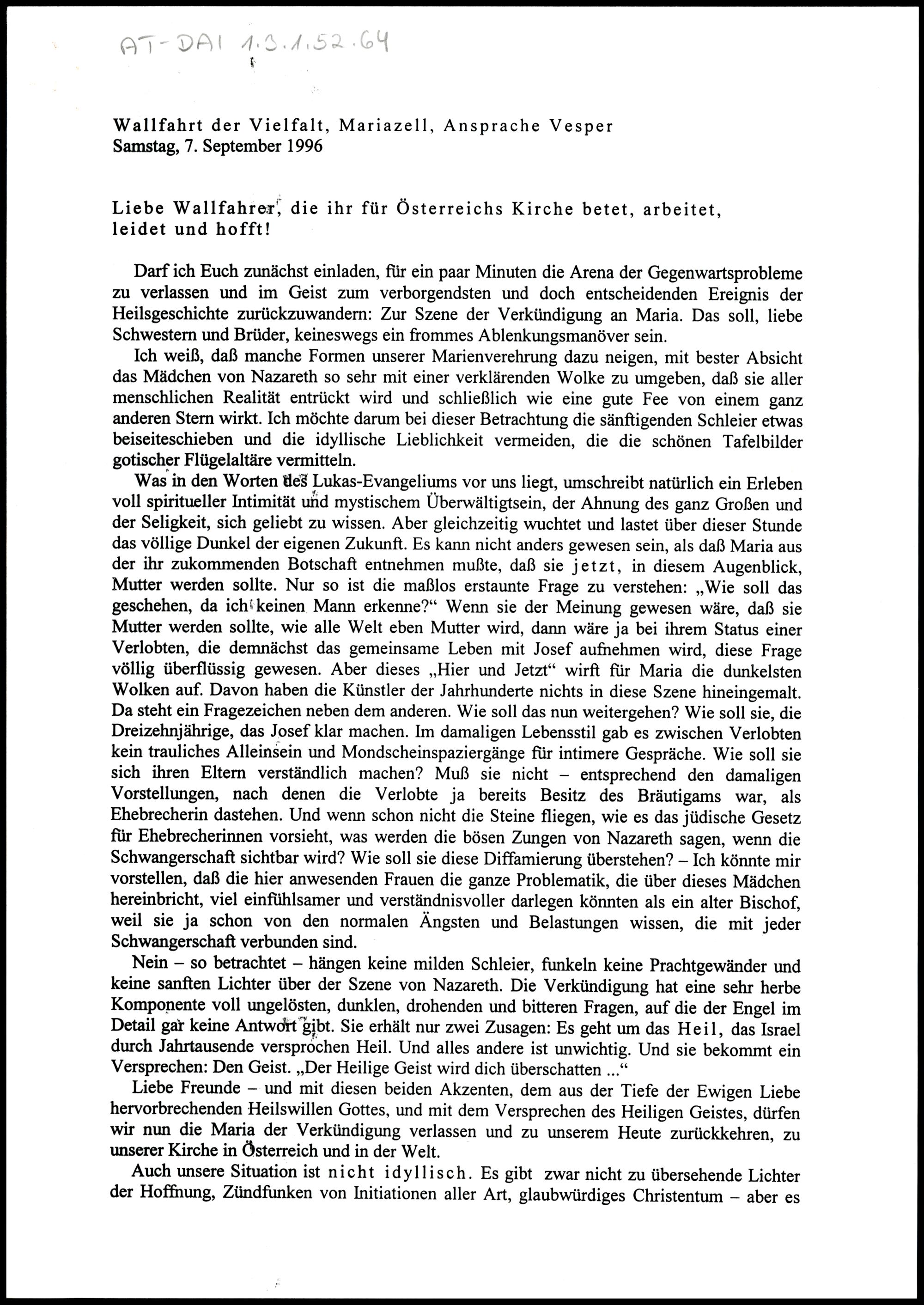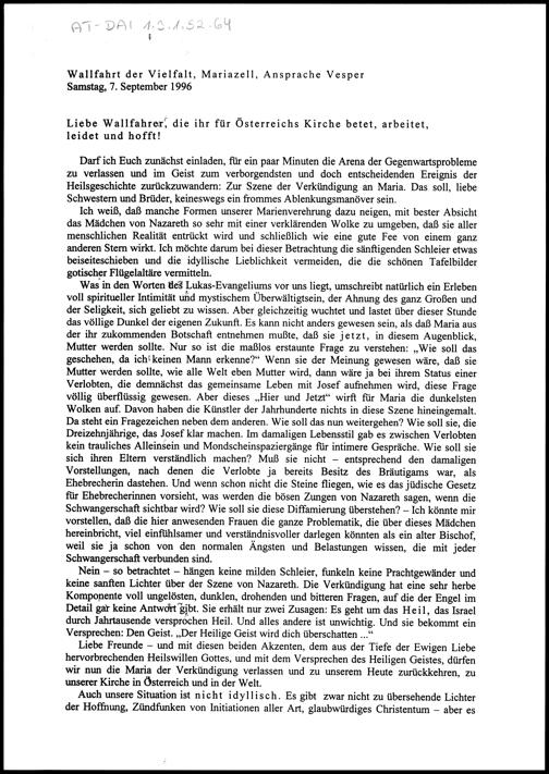 Liebe Wallfahrer, die ihr für Österreichs Kirche betet, arbeitet, leidet und hofft!