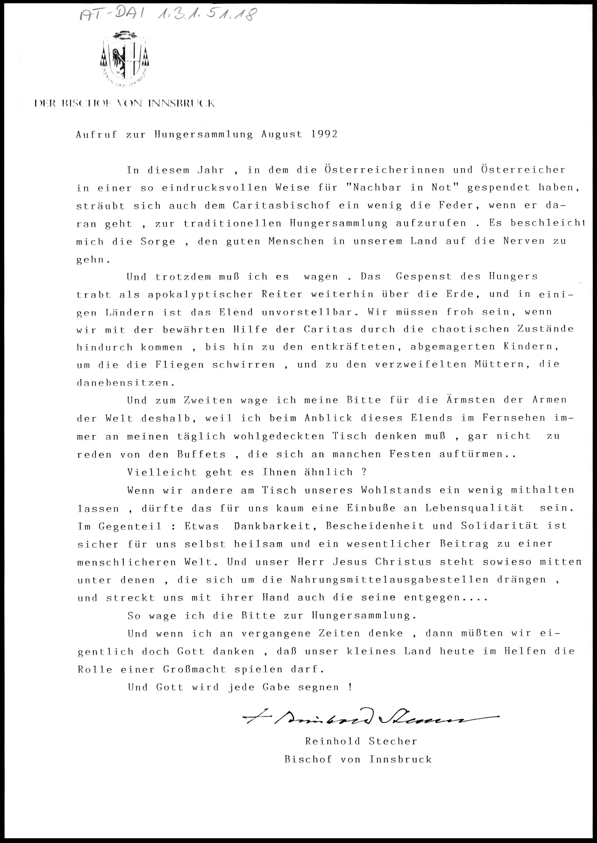 Aufruf zur Hungersammlung August 1992