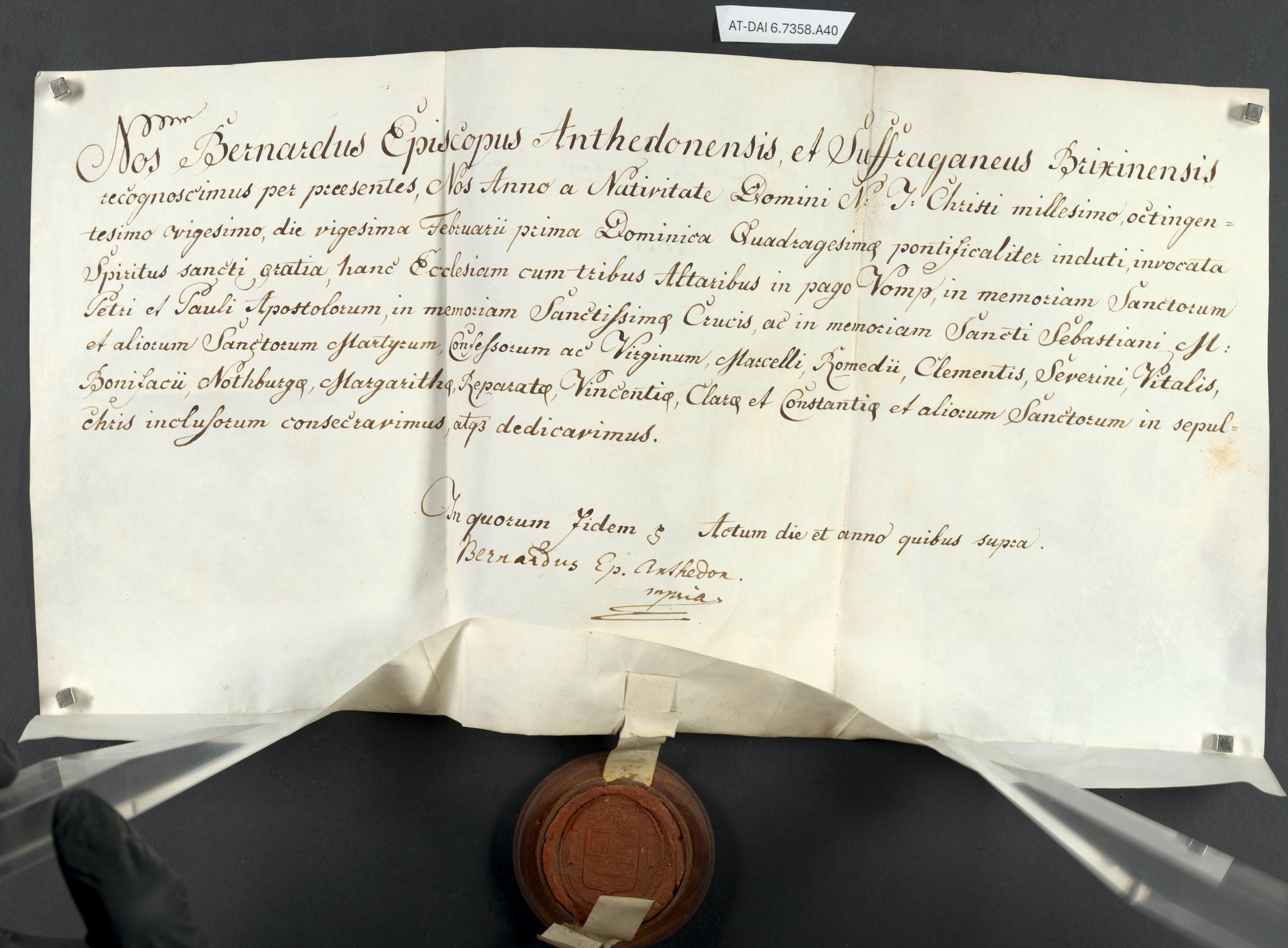 Weihebrief neue Pfarrkirche zu Vomp mit drei Altären