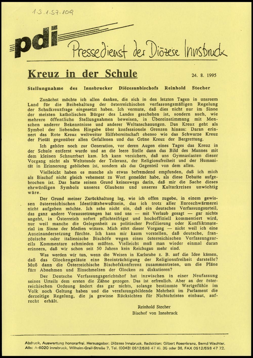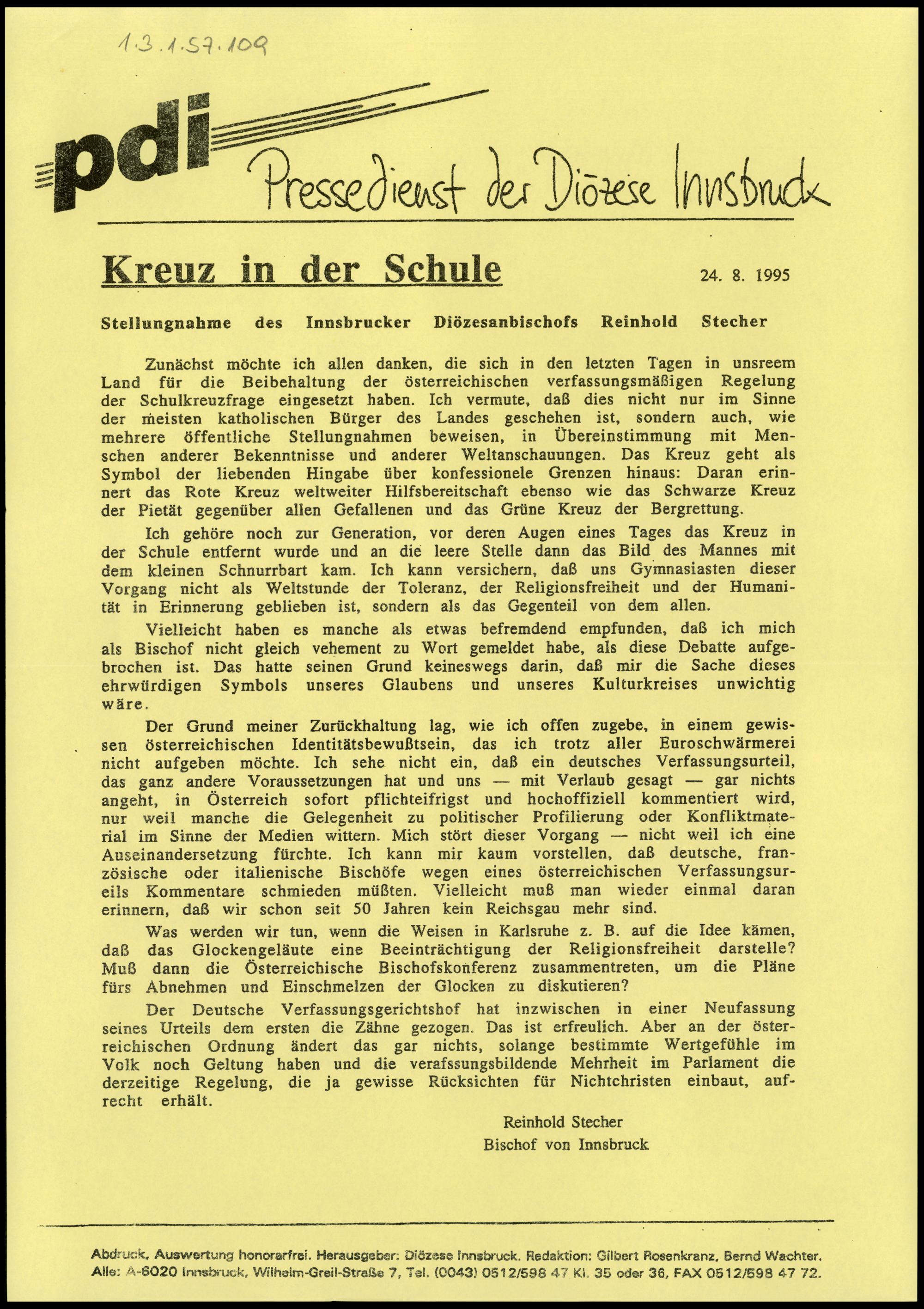Stellungnahme Bischof Stecher, 24.8.1995