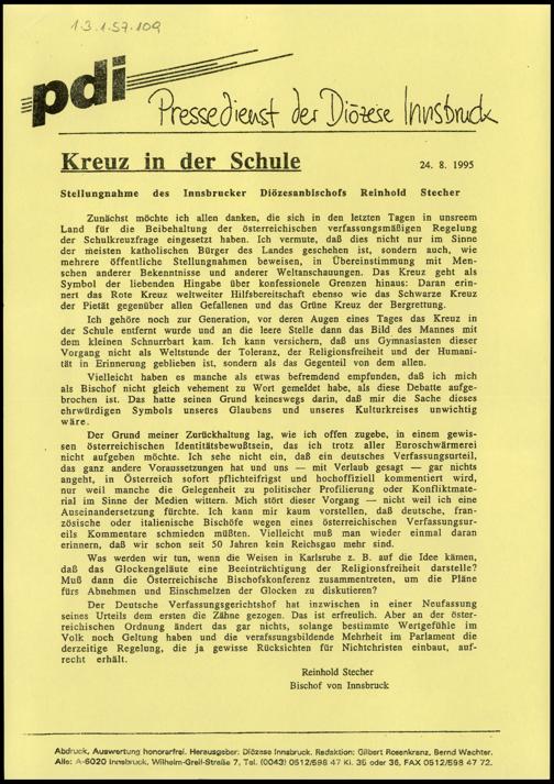 Kreuz in der Schule, Aussendung des Pressedienstes der Diözese Innsbruck