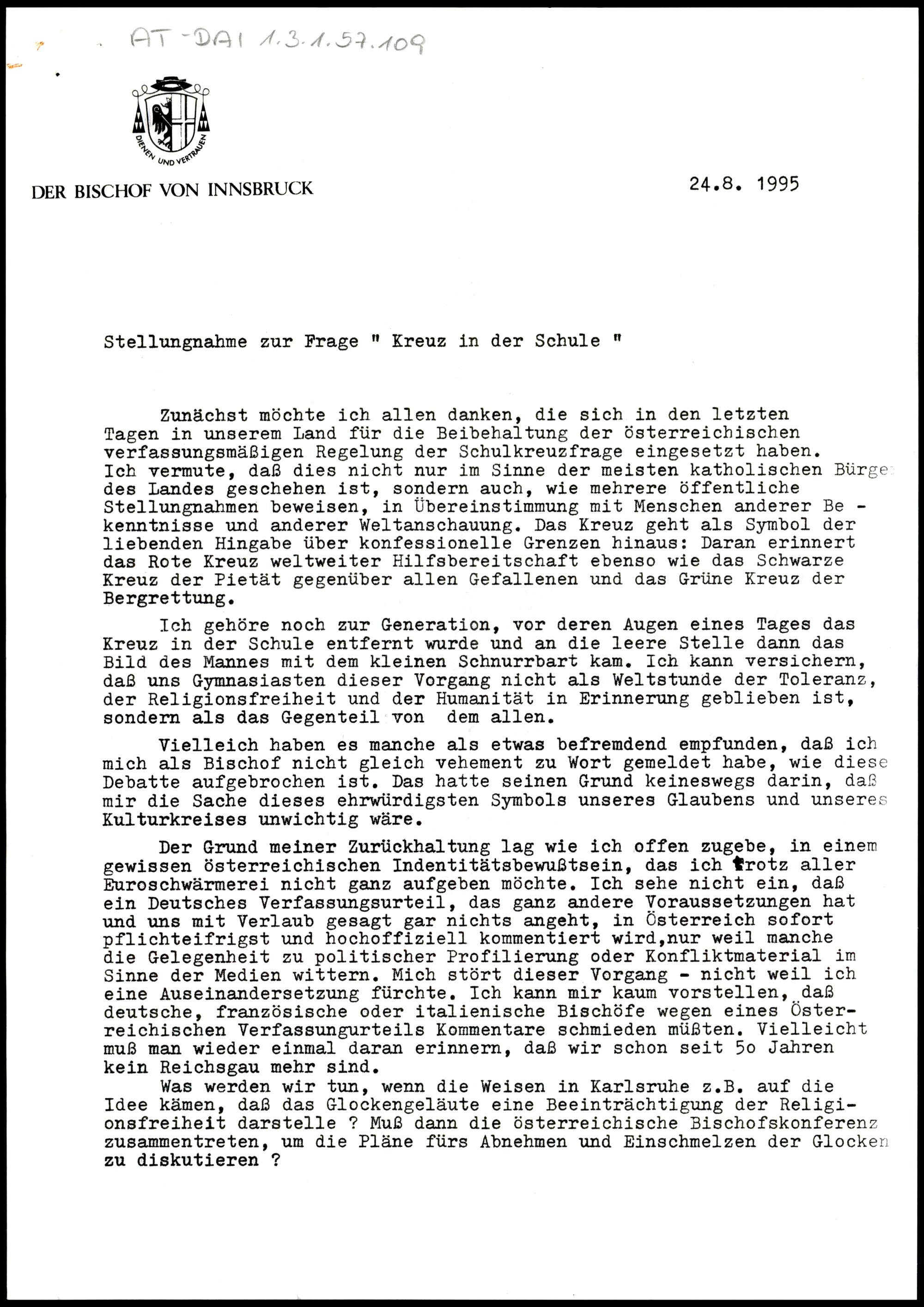 Kreuz in der Schule, Aussendung des Pressedienstes der Diözese Innsbruck
