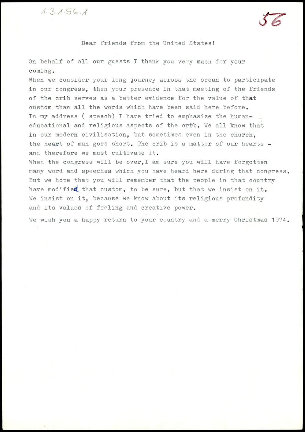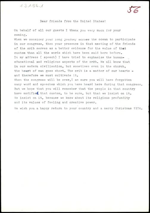 Grußworte zum Weltkrippenkongress Innsbruck 1974.