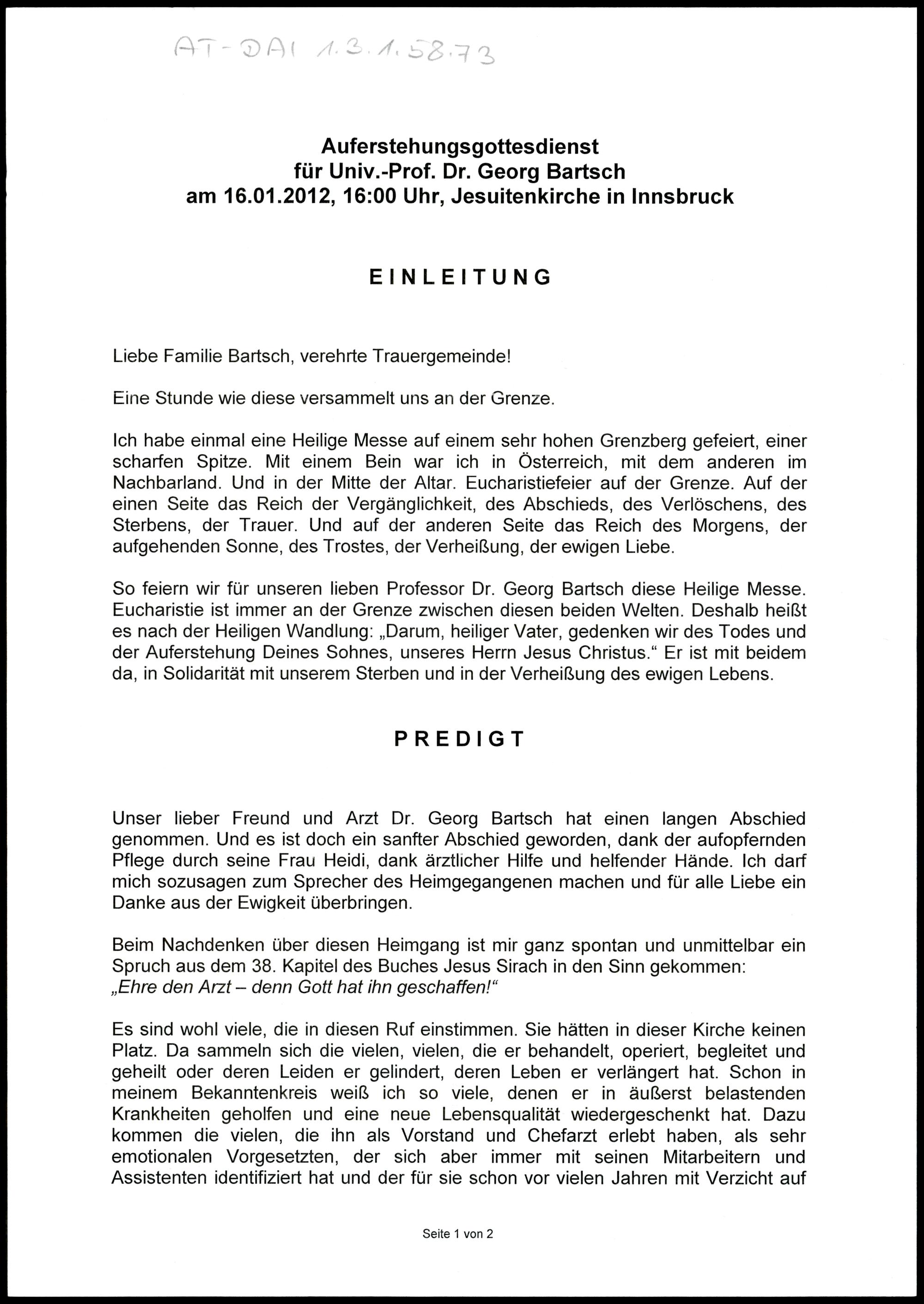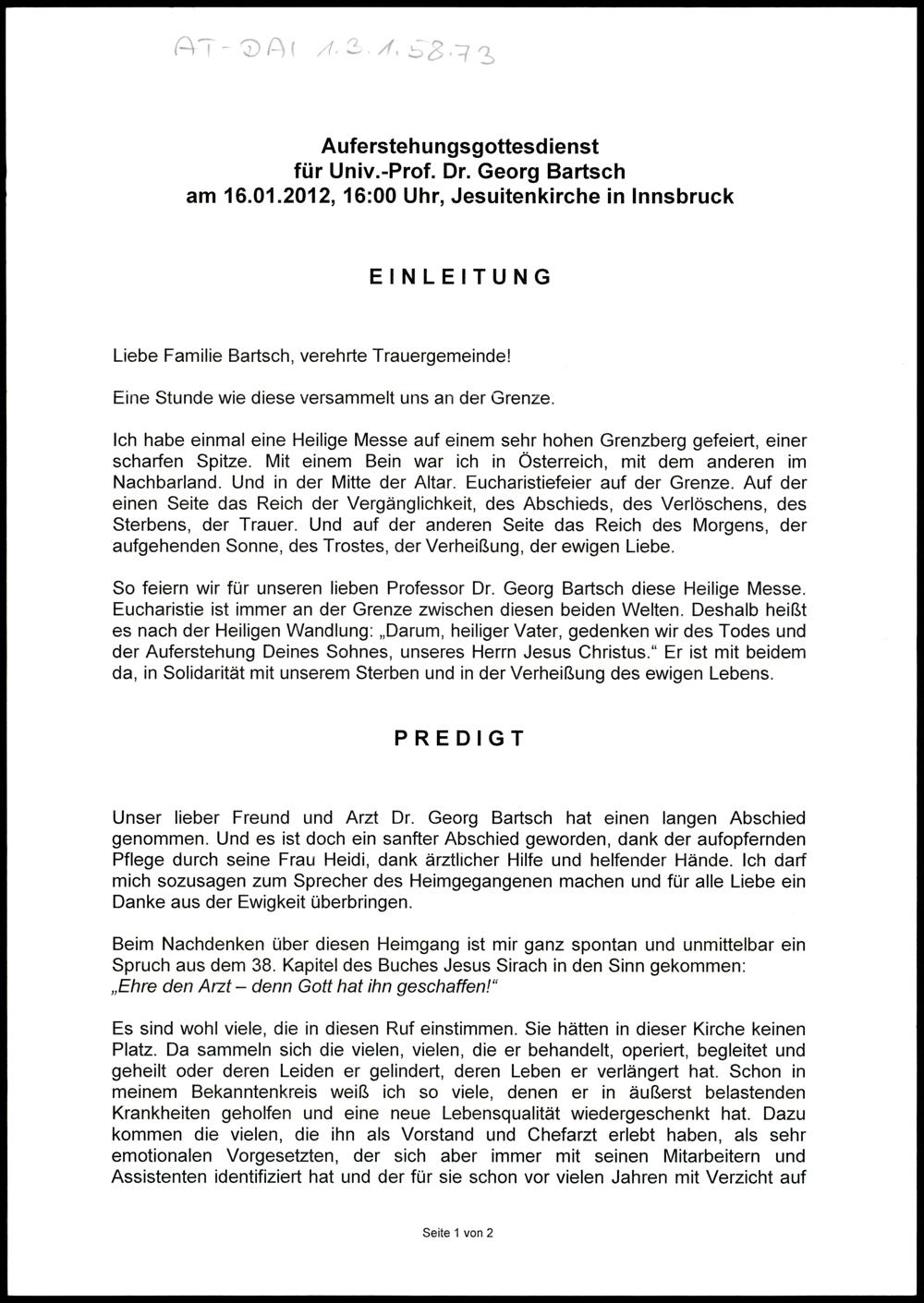 Auferstehungsgottesdienst für Univ.-Prof. Dr. Georg Bartsch