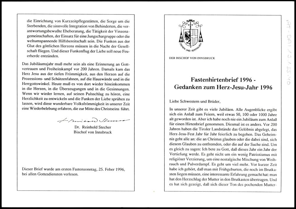 Fastenhirtenbrief 1996 im Verordnungsblatt der Diözese Innsbruck, 15.2.1996, Nr. 1