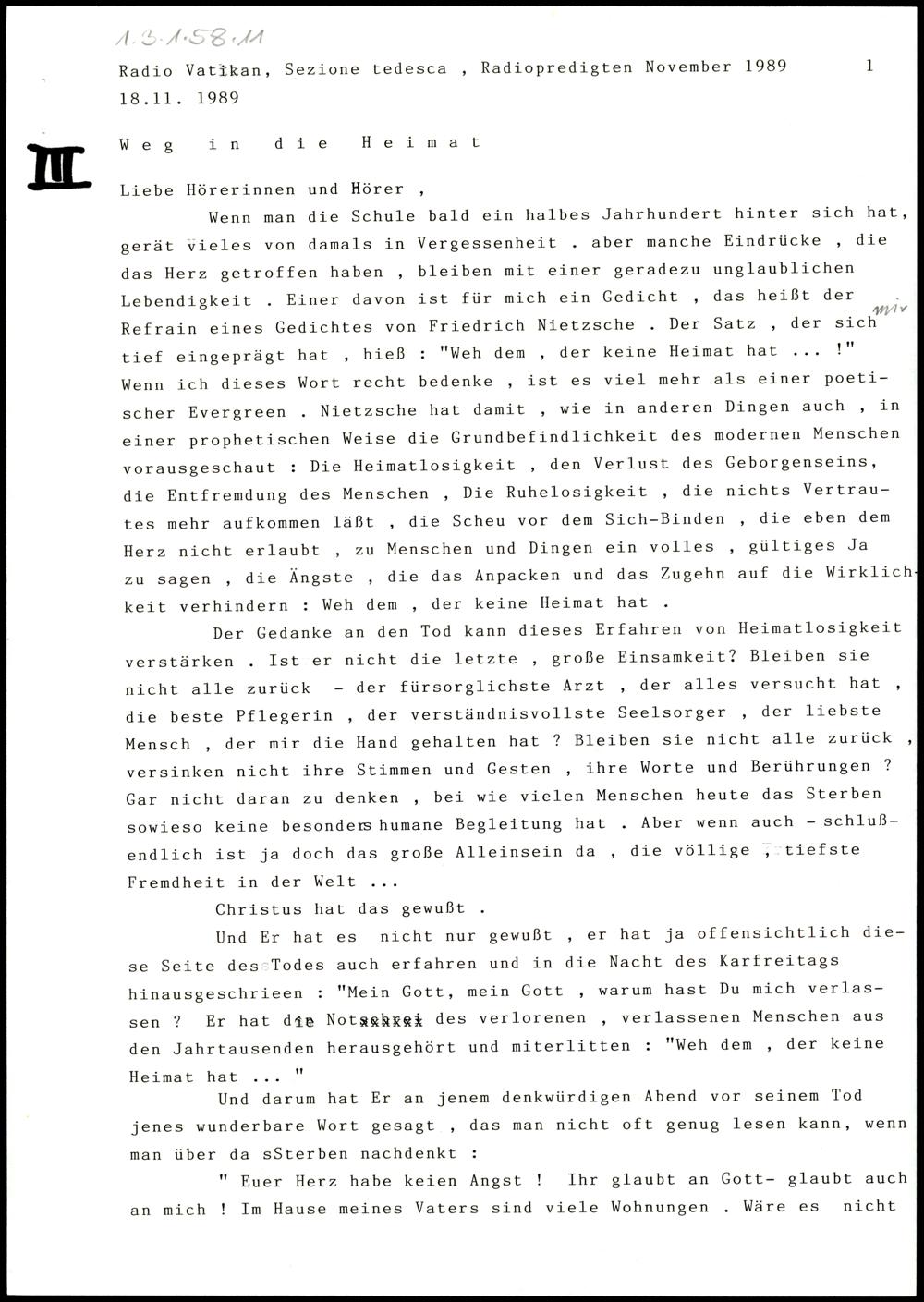 Radio Vatikan, Radiopredigten für November 1989