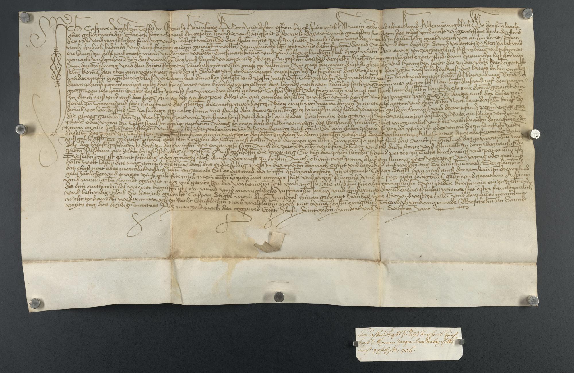 Vorderseite, Plica geschlossen, Rest der Pressel sichtbar und Notiz