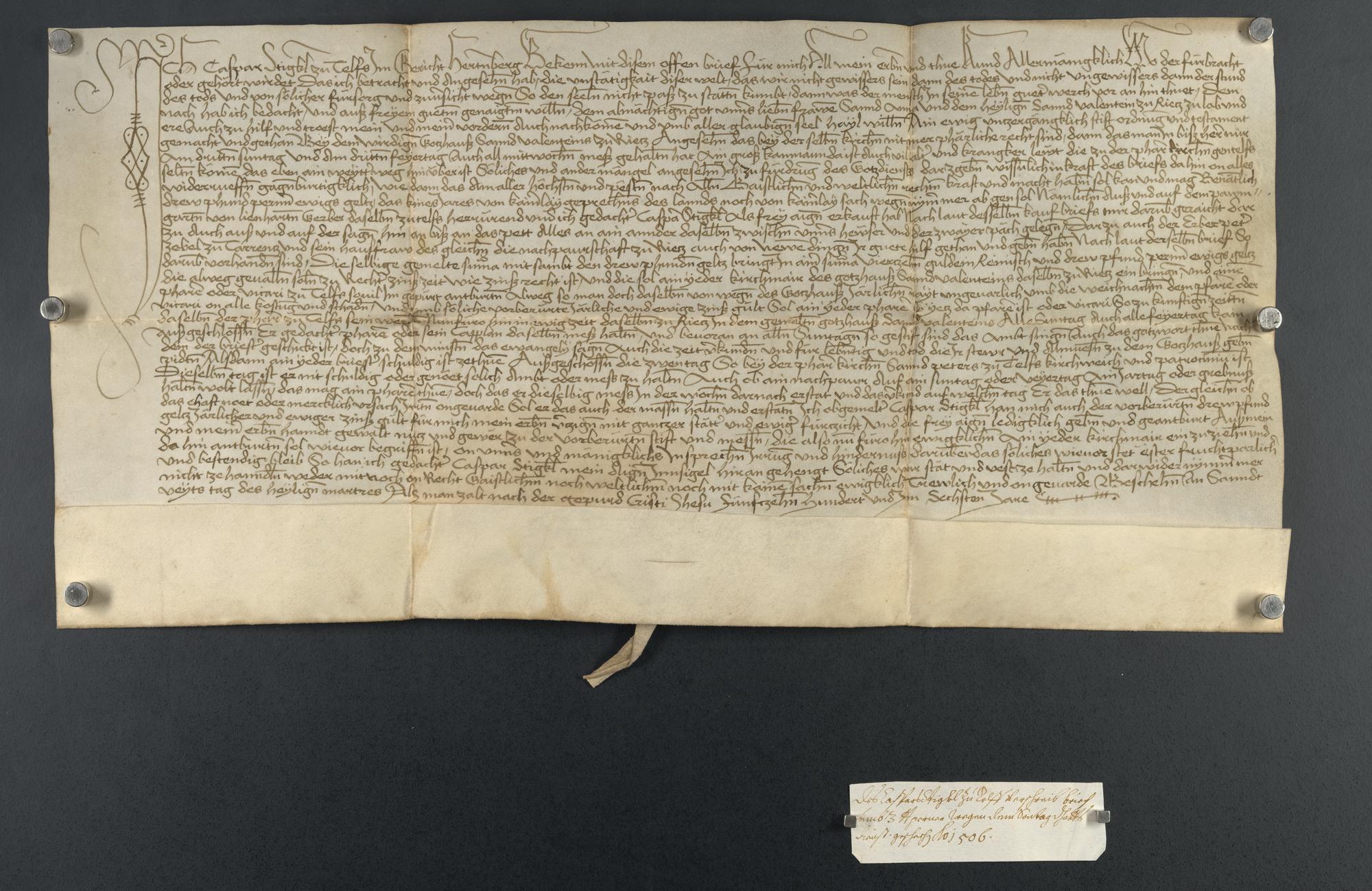 Vorderseite, Plica geschlossen, Rest der Pressel sichtbar und Notiz