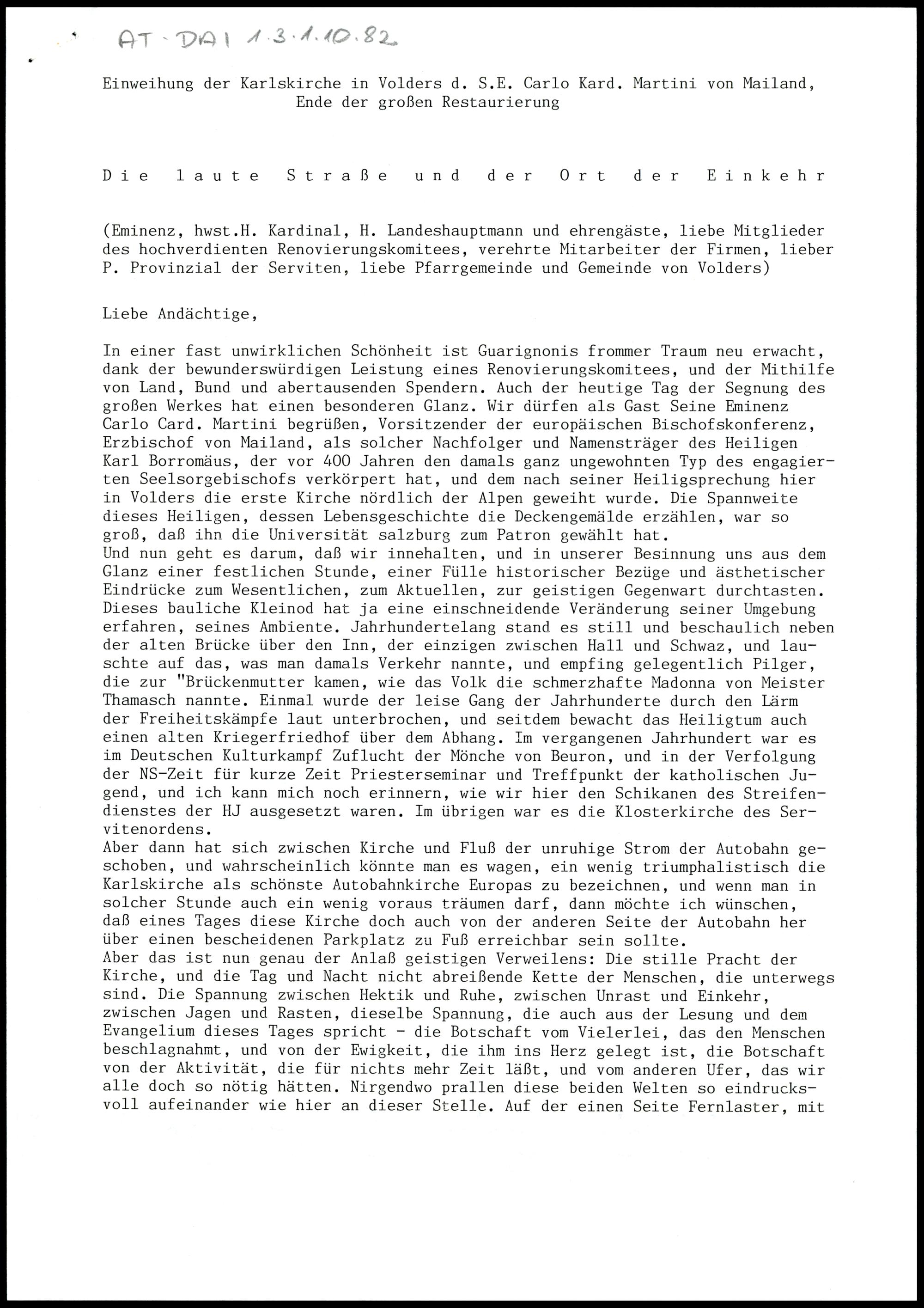 Einweihung der Karlskirche in Volders d. S.E. Carlo Kard. Martini von Mailand, Ende der großen Restaurierung