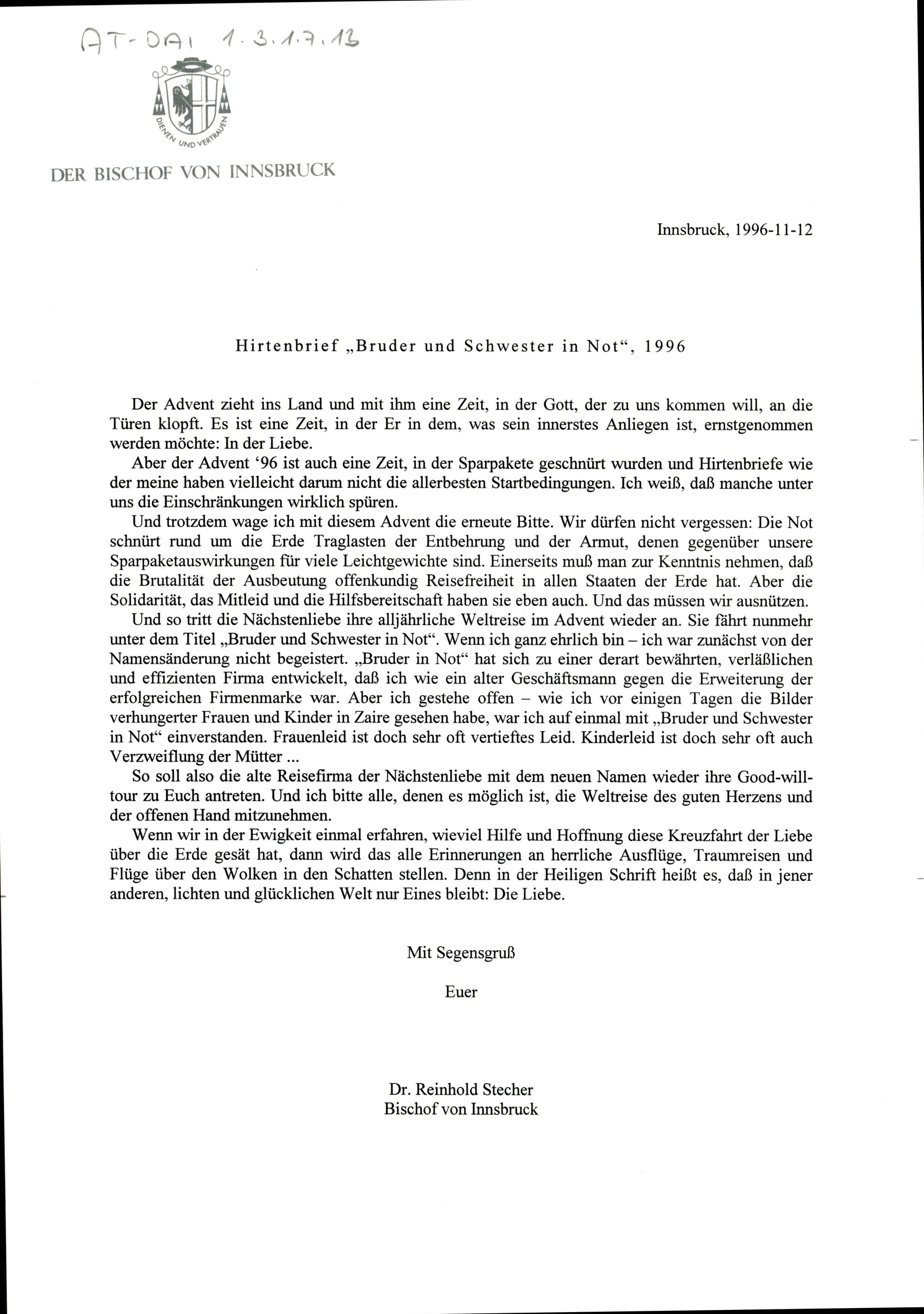 Hirtenbrief zu Bruder und Schwester in Not