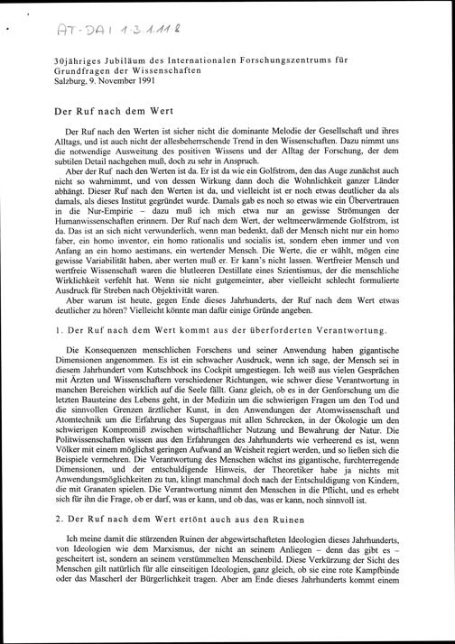 30jähriges Jubiläum des Internationalen Forschungszentrum für Grundfragen der Wissenschaften in Salzburg