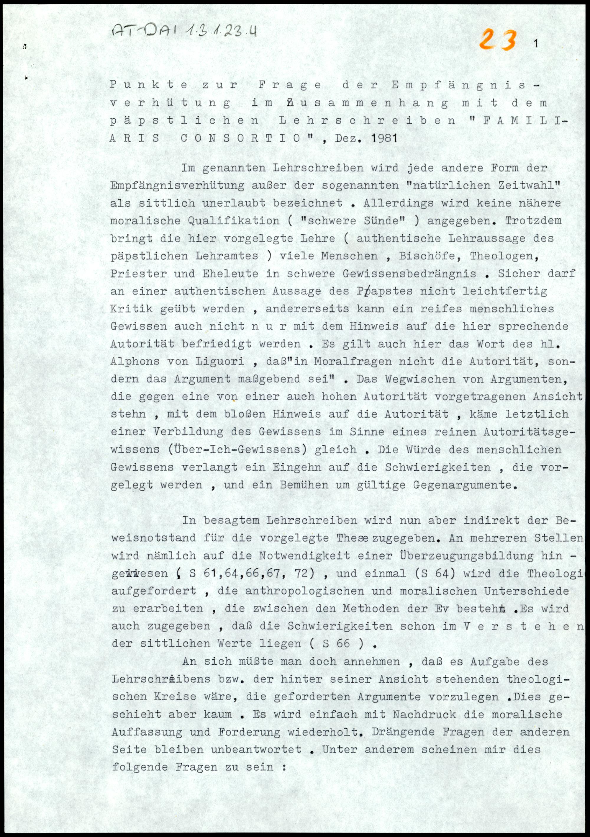 Punkte zur Frage der Empfängnisverhütung im Zusammenhang mit dem päpstlichen Lehrschreiben "FAMILIARIS CONSORTIO"