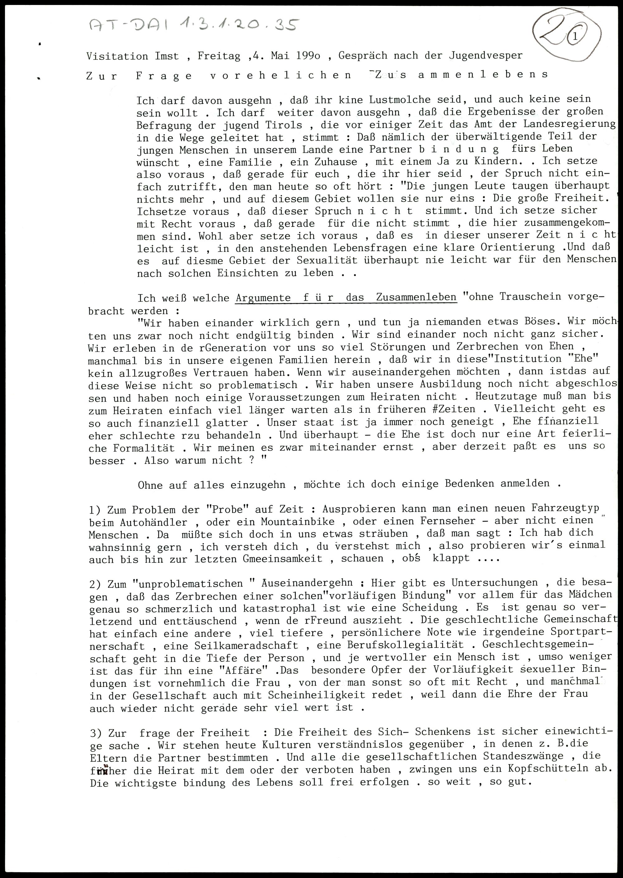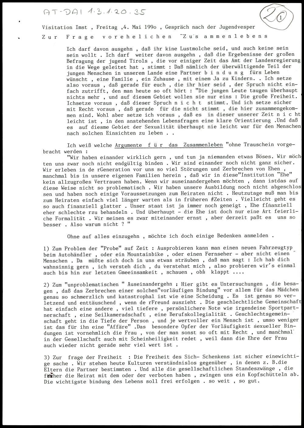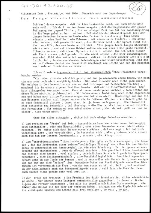 Zur Frage vorehelichen Zusammenlebens; Die Frage der Frau in der Kirche; Kirchenaustritte und Kirchenbeitrag.