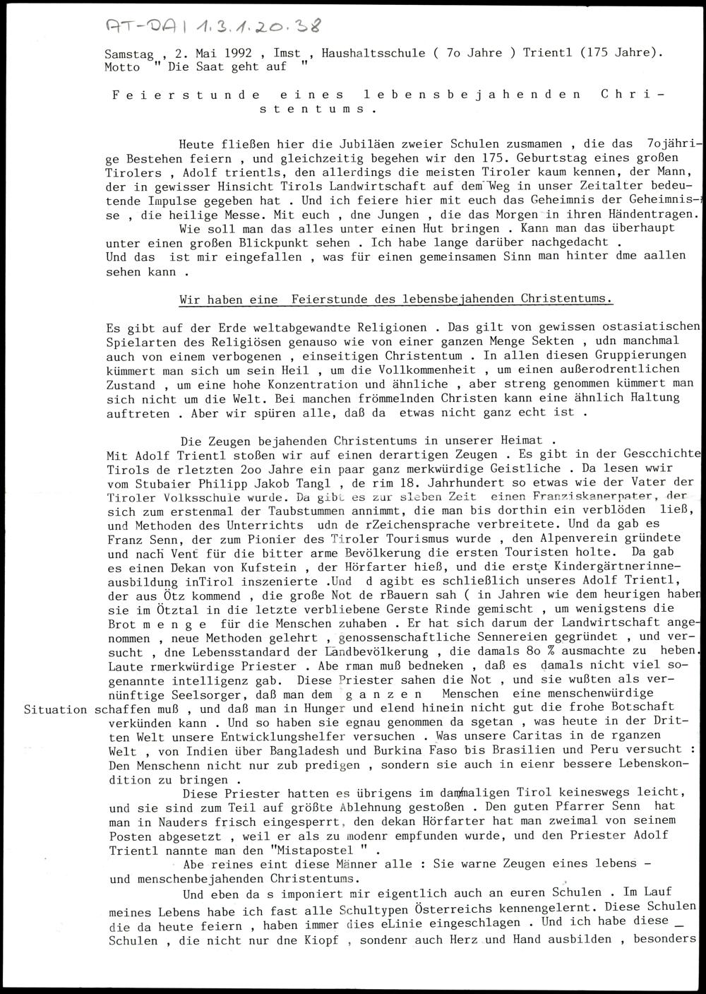 Feierstunde eines lebensbejahenden Christentums