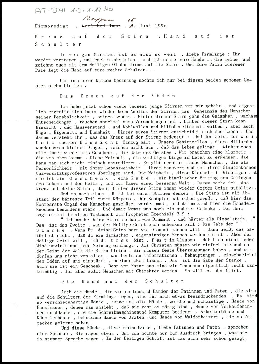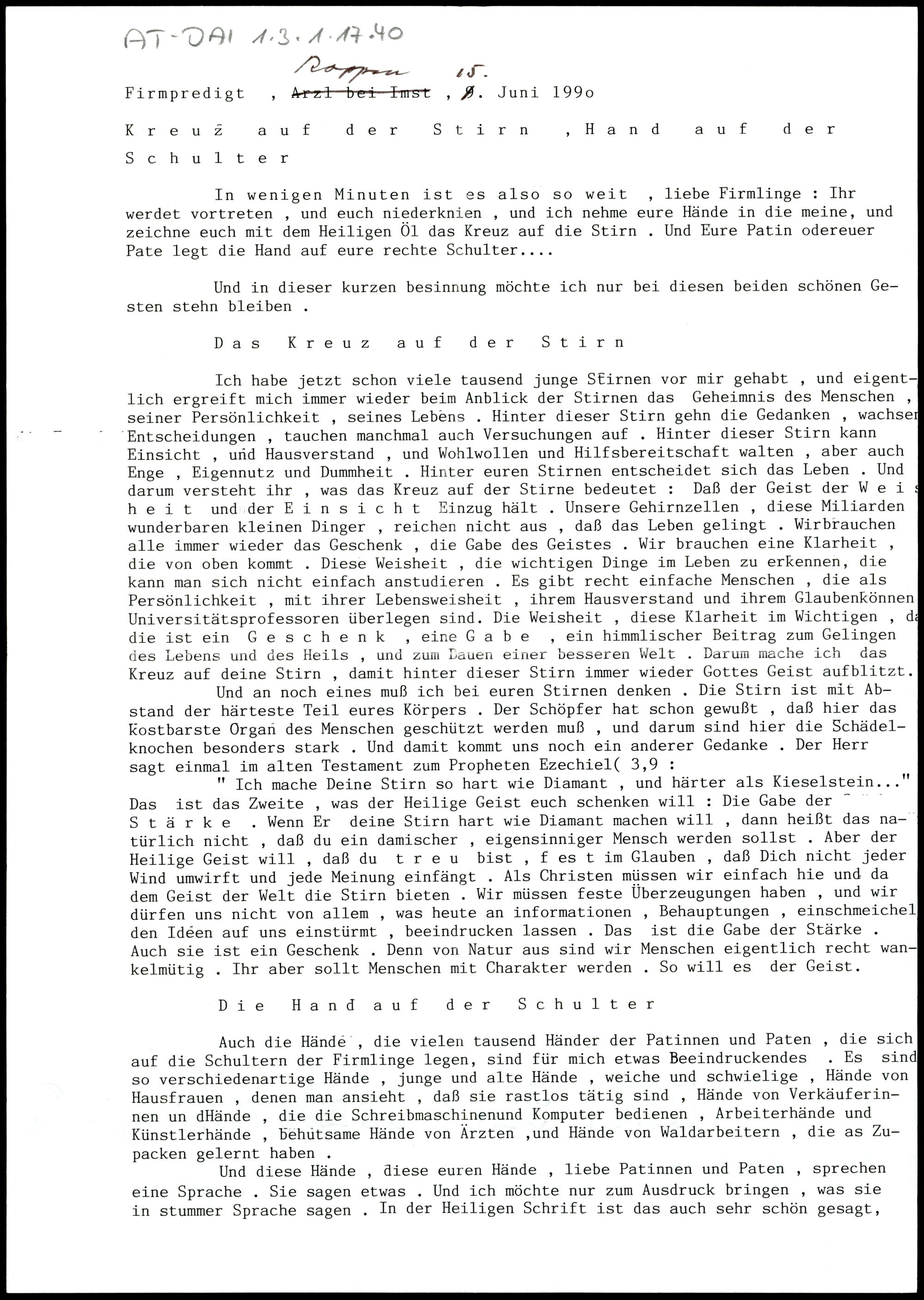 Kreuz auf der Stirn, Hand auf der Schulter
