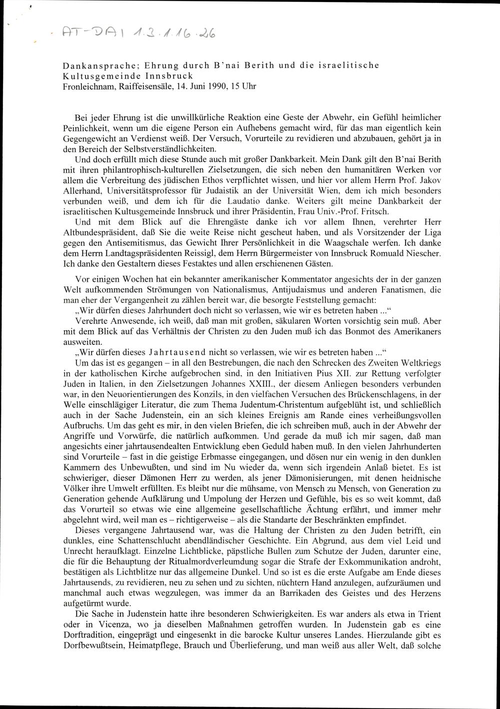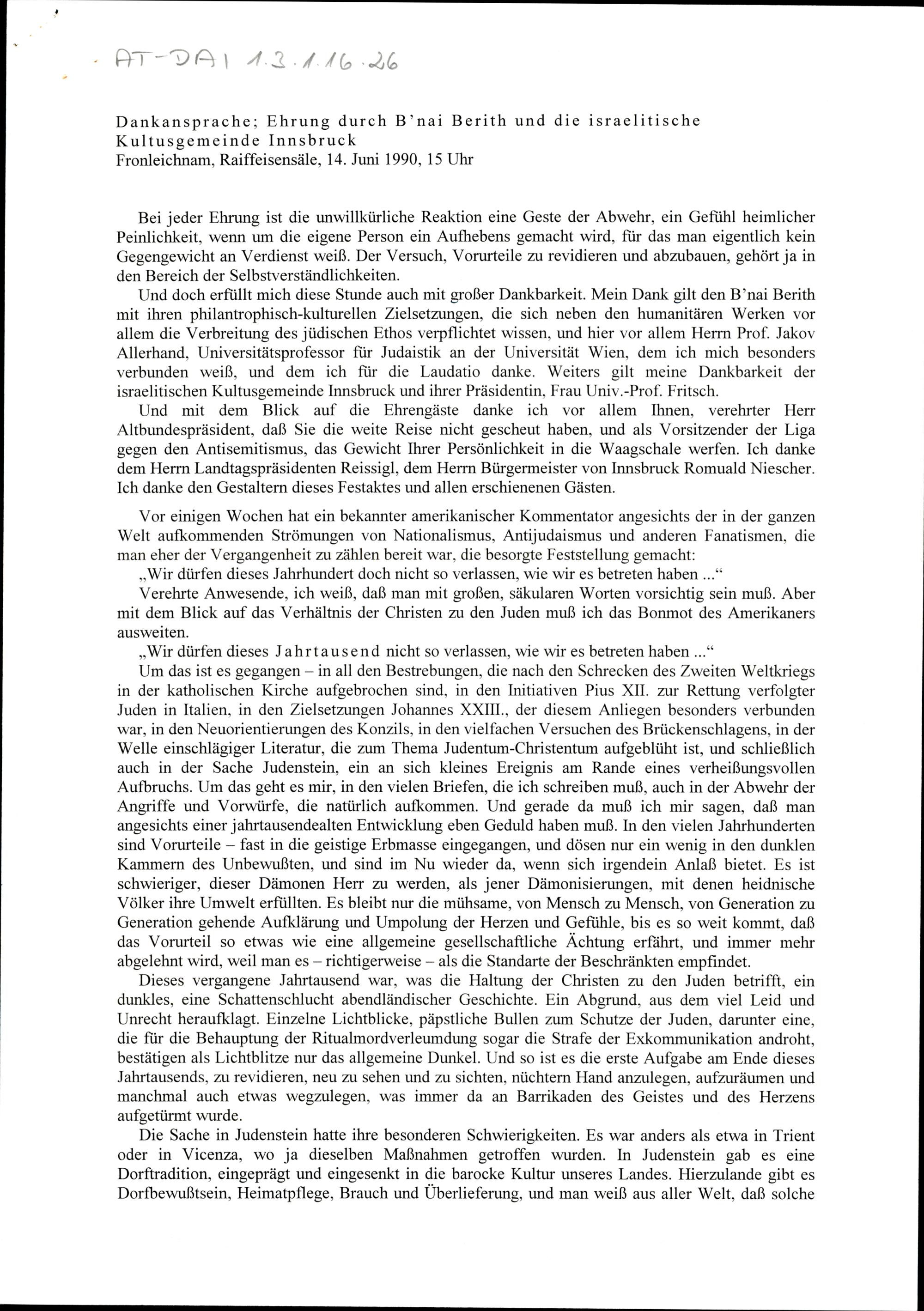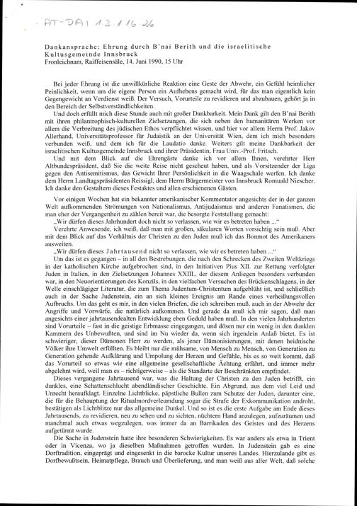 Dankansprache Ehrung durch B´nai Berith und die israelitische Kultusgemeinde Innsbruck