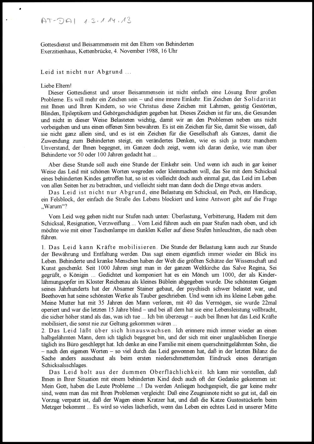 Gottesdienst und Beisammensein mit den Eltern von Behinderten