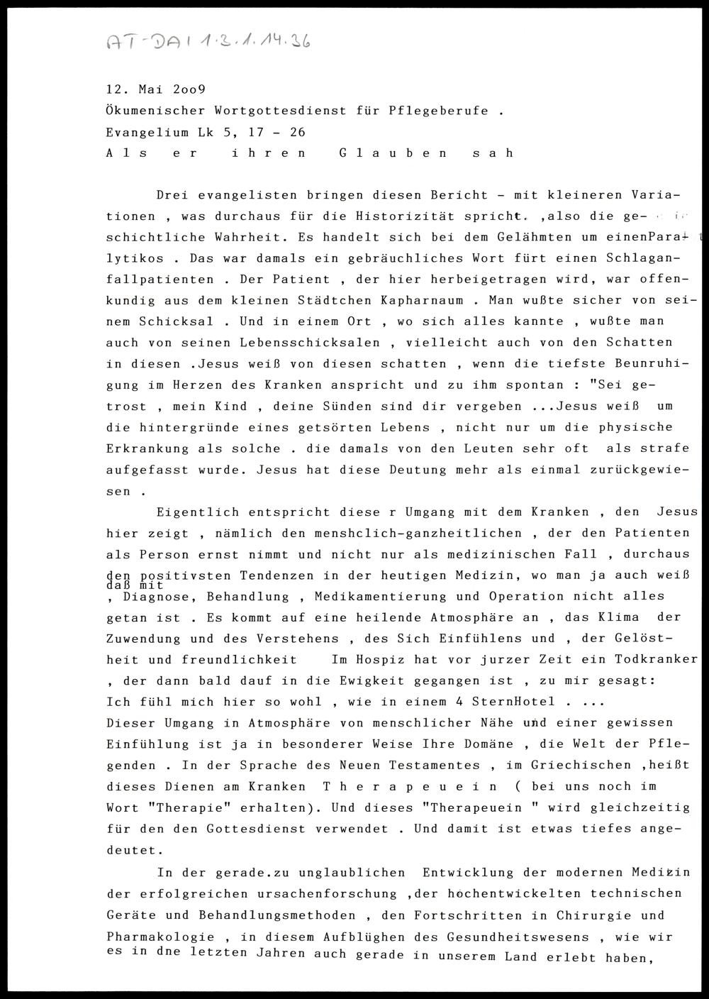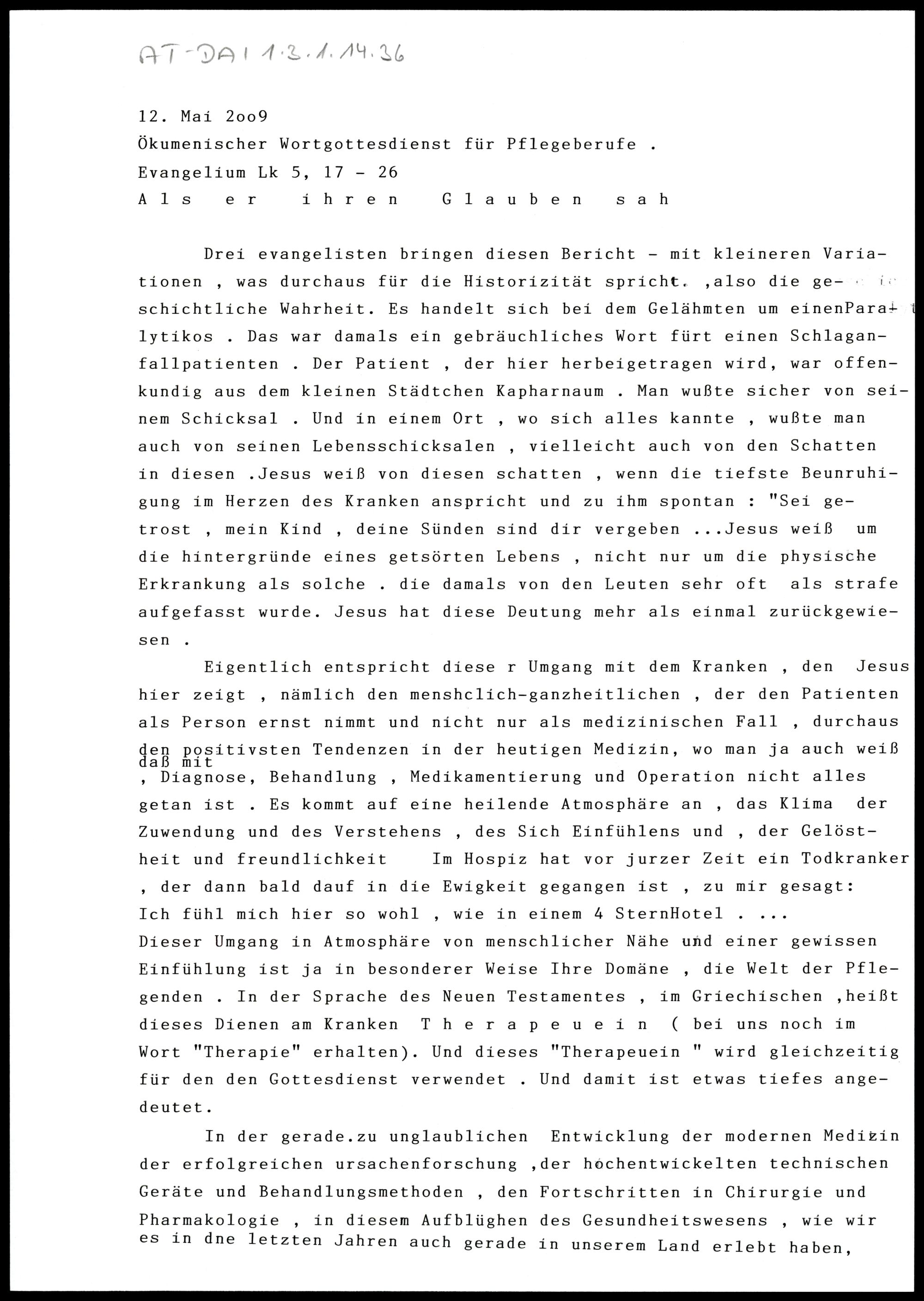 Ökumenischer Wortgottesdienst für Pflegeberufe