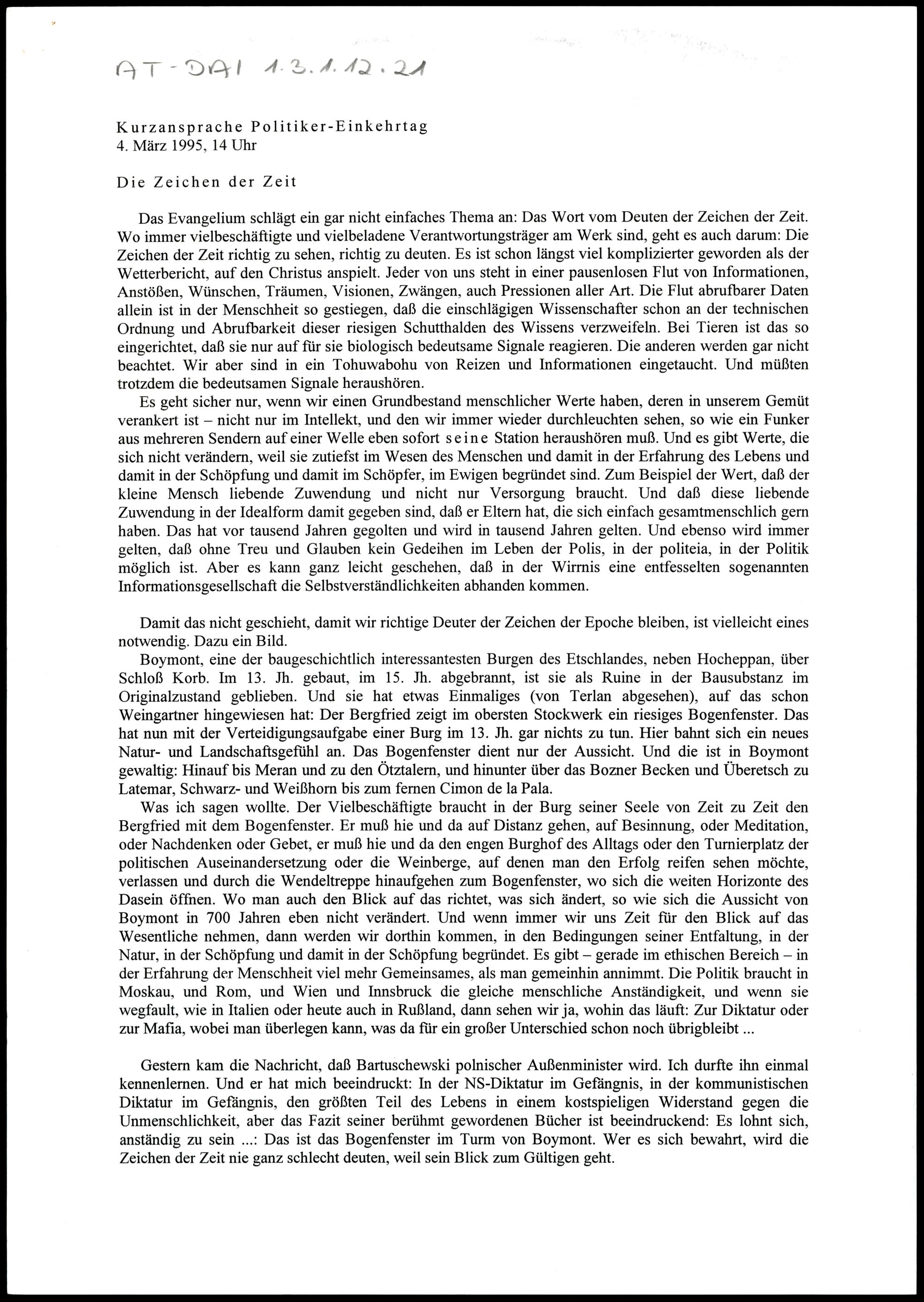 Kurzansprache Politiker-Einkehrtag